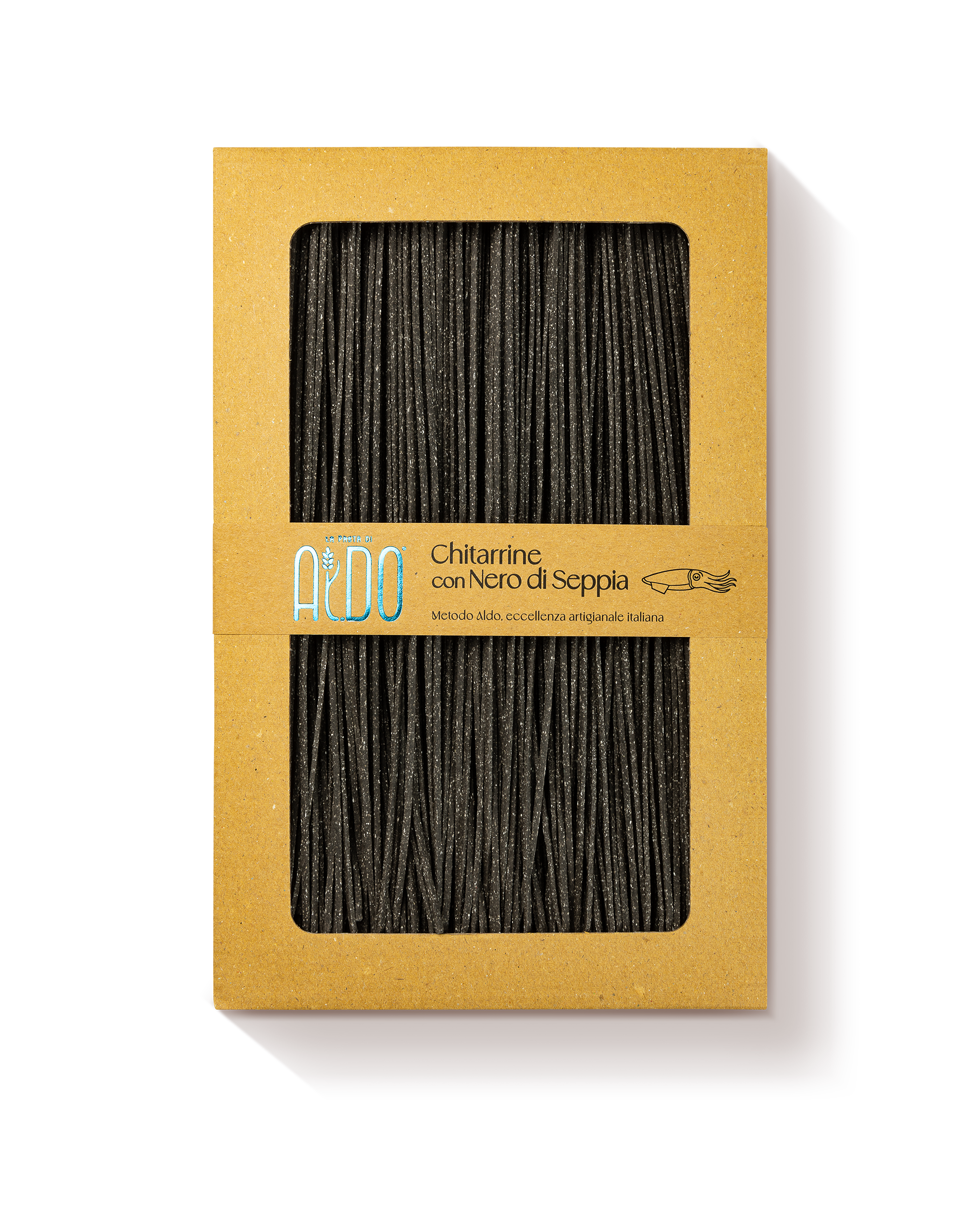 Sicuramente sono le Chitarrine più particolari. Di un nero intenso che seduce attraverso la finestrella di cellophan alimentare, sembrano voler balzare fuori dalla cornice in cartapaglia per immergersi subito nell’acqua di cottura e trionfare così in un nero ancora più brillante, un vero visibilio per gli occhi. Annusando il vapore di cottura si intuisce quell’impercettibile profumo di nero di seppia che le rende così originali. Esaltate con sughi bianchi a base di pesce, stanno benissimo anche con verdure e olio extra vergine di oliva. Da gustare per capire che la Pasta di Aldo è la Pasta all’Uovo.