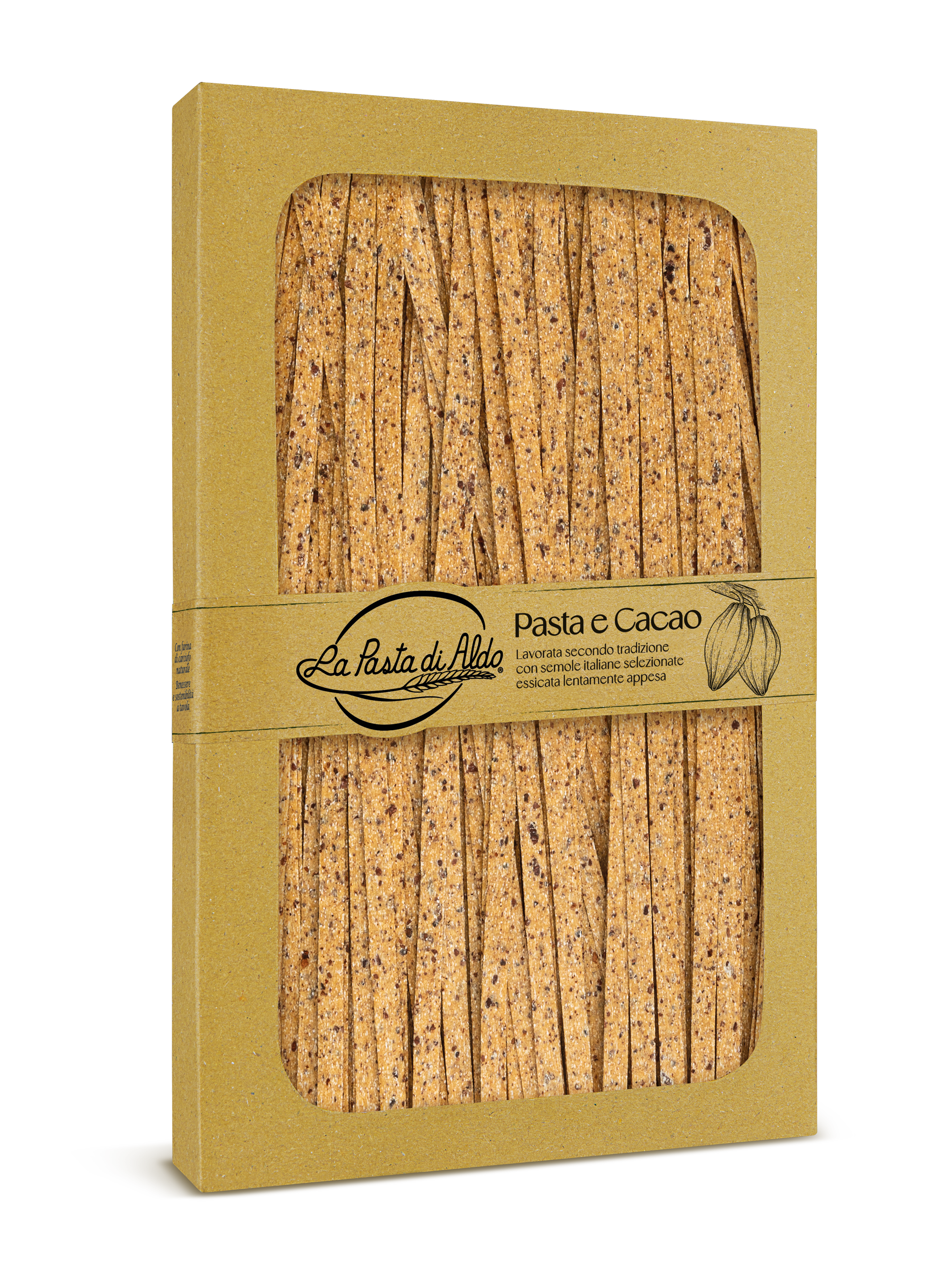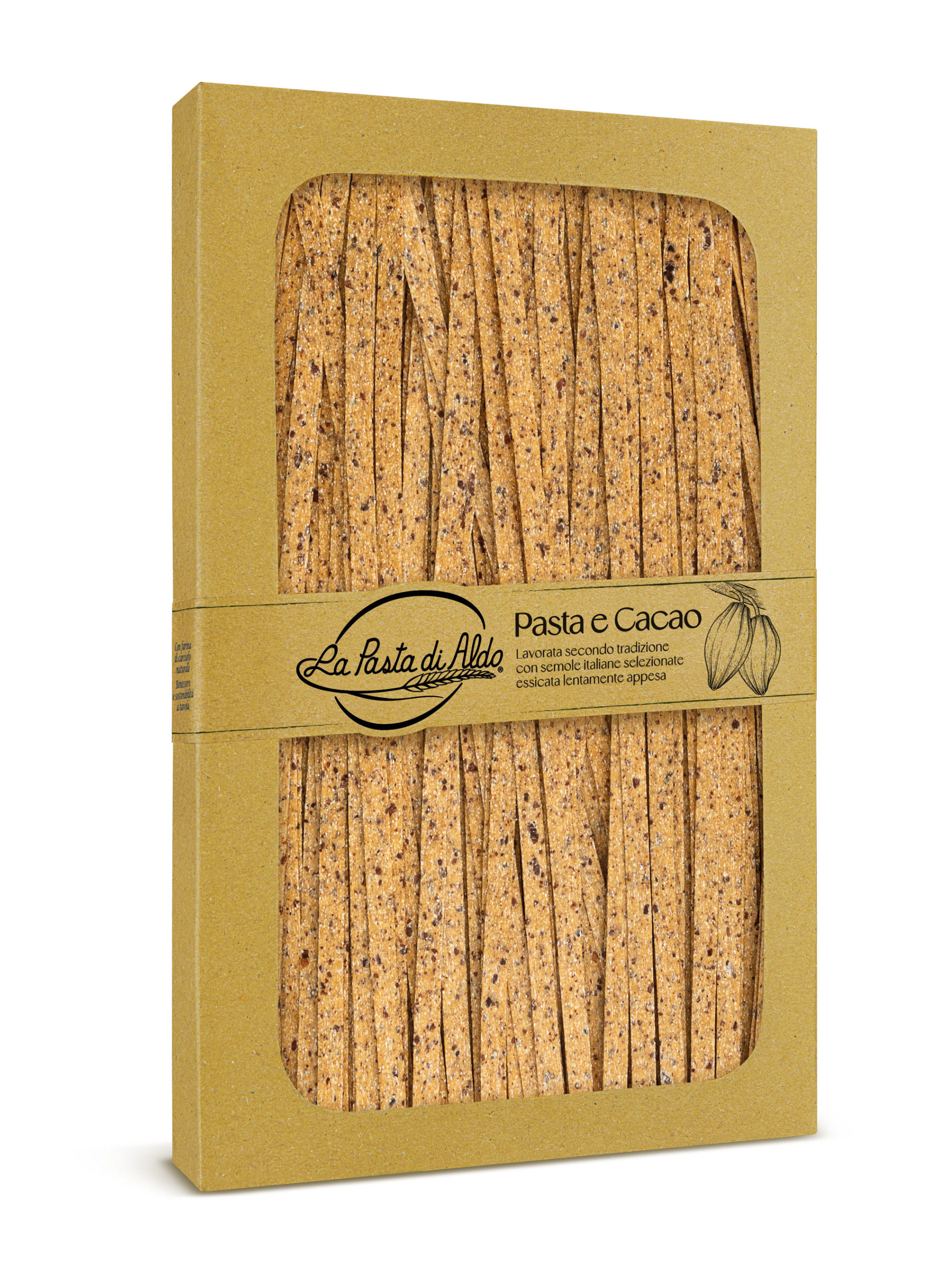Ingredienti: semola di grano duro, uova 32%, buccia di fave di cacao tostate 6%, granella di fave di cacao tostate 2%